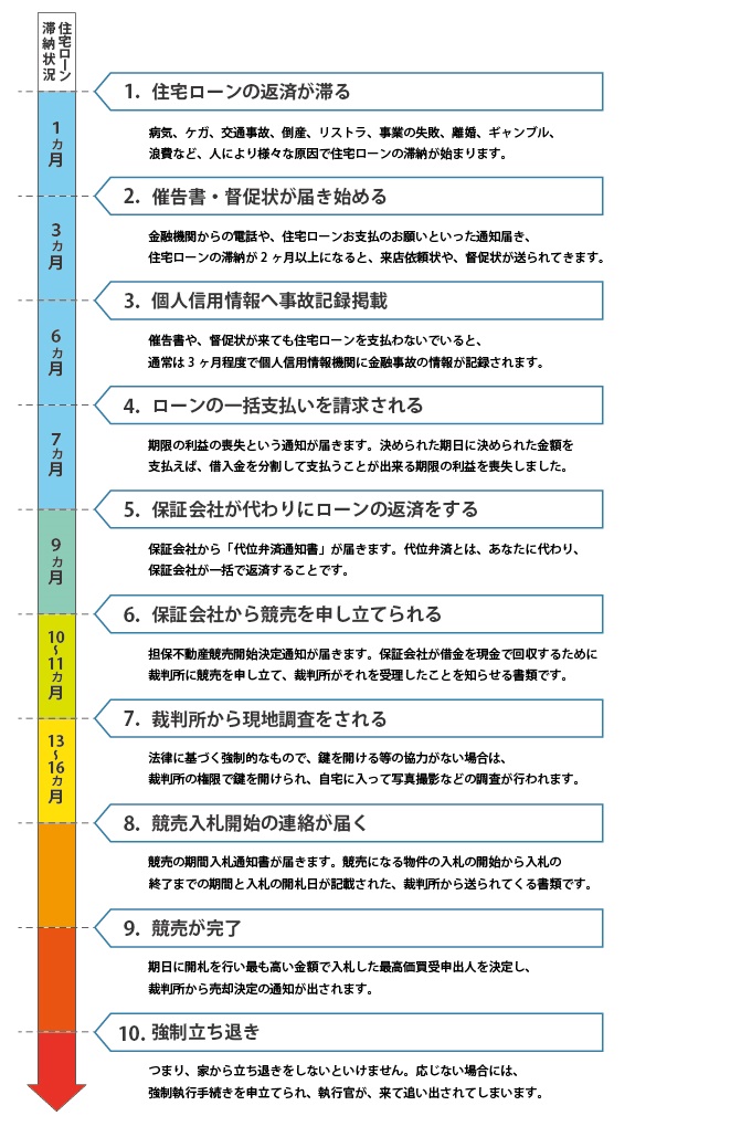 退職、減給、病気、ケガ、離婚、ギャンブル・・・いろいろな理由で住宅ローンが払えなくなったというご相談をいただきます。交通事故、逮捕など予期せぬ理由で住宅ローンが払えなくなる場合もあります。 このページでは住宅ローンが払えなくなったらどうなるのか、を説明します。下の図は住宅ローンが払えなくなってから、起こる出来事です。ざっくりと、あなたの身に降りかかることを中心にした図です。
